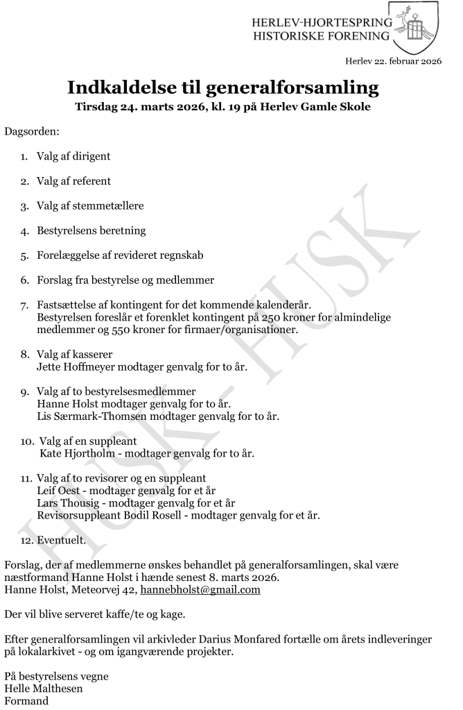 Herunder indkaldelsen til foreningens generalforsamling tirsdag d. 24. marts 2026, kl. 19:00 på Herlev Gamle Skole.