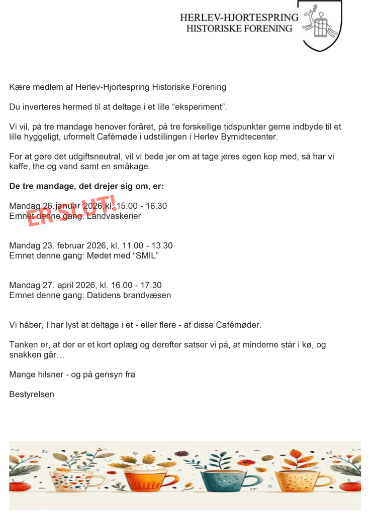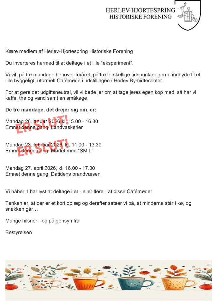 Herunder en invitation til de tre planlagte Cafémøder i vores udstillingslokale i Herlev Bymidte.